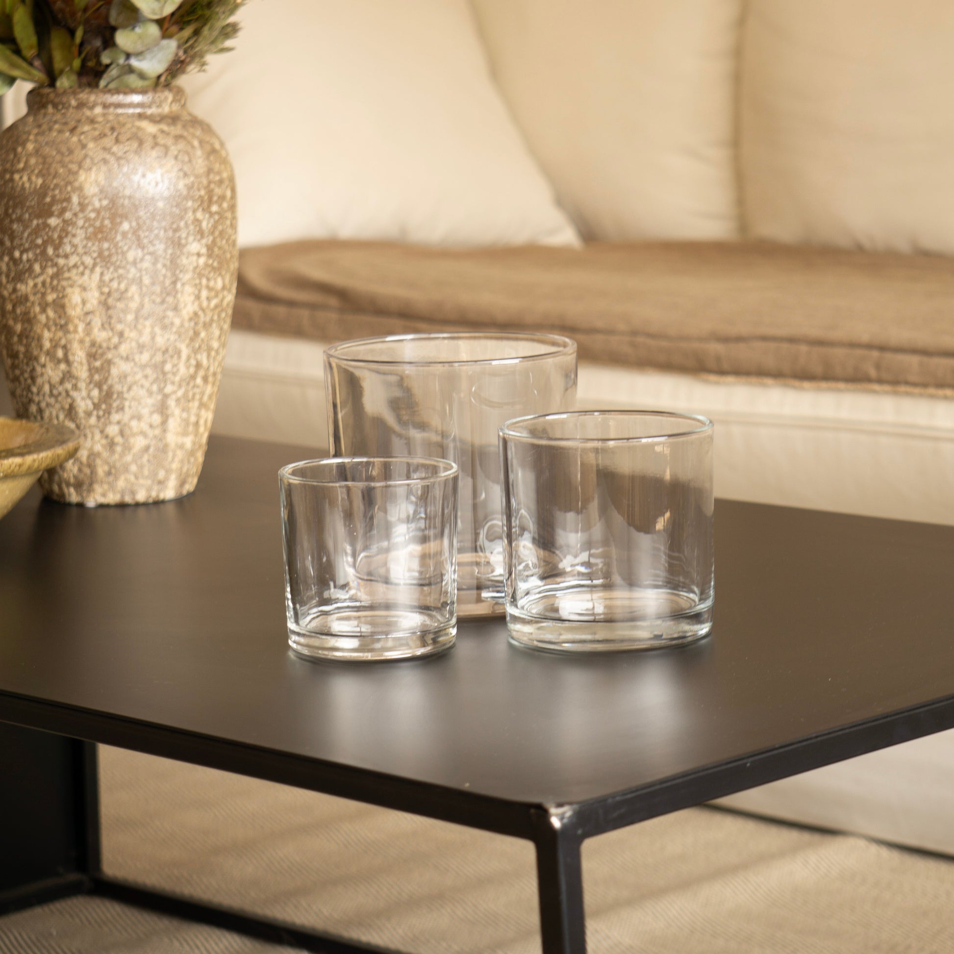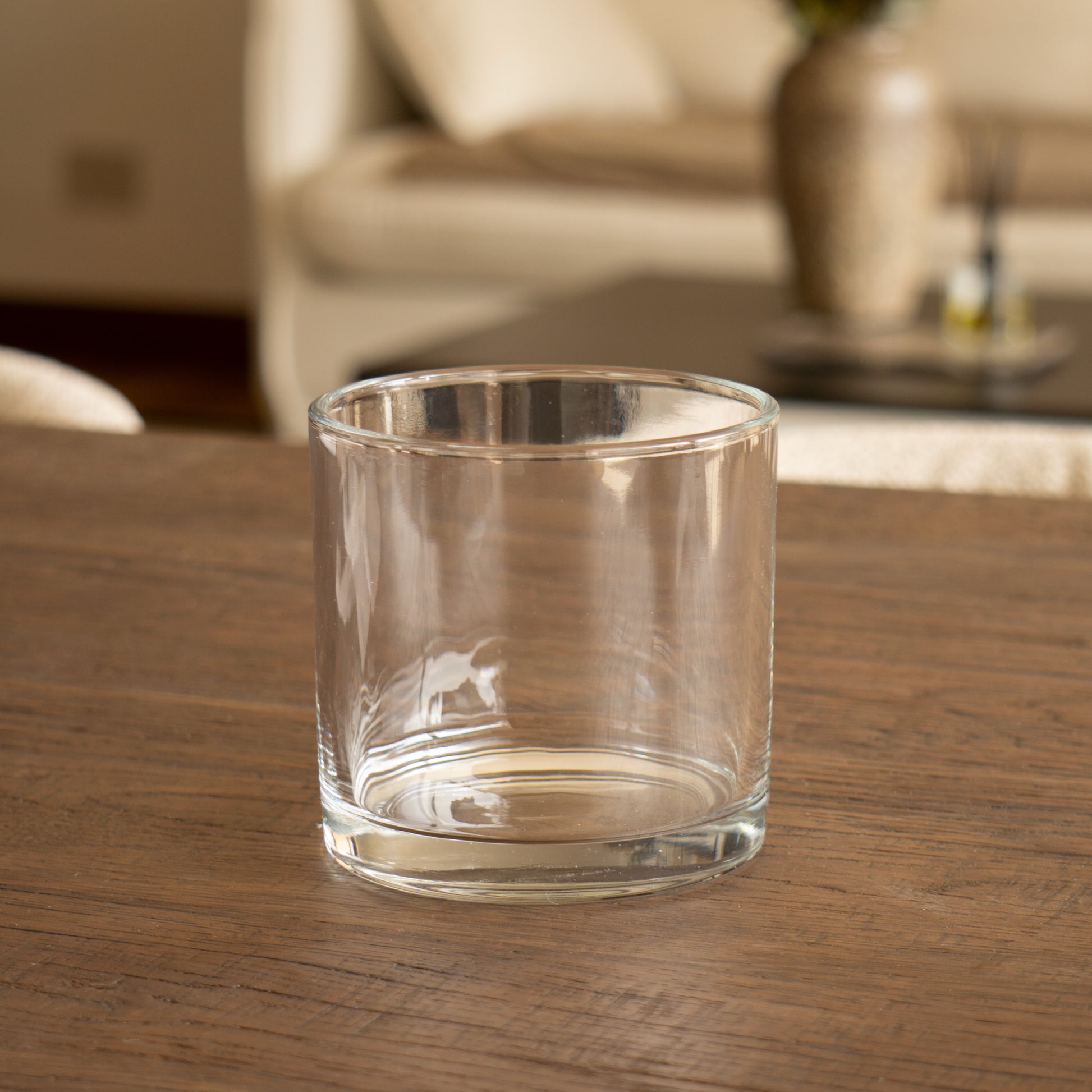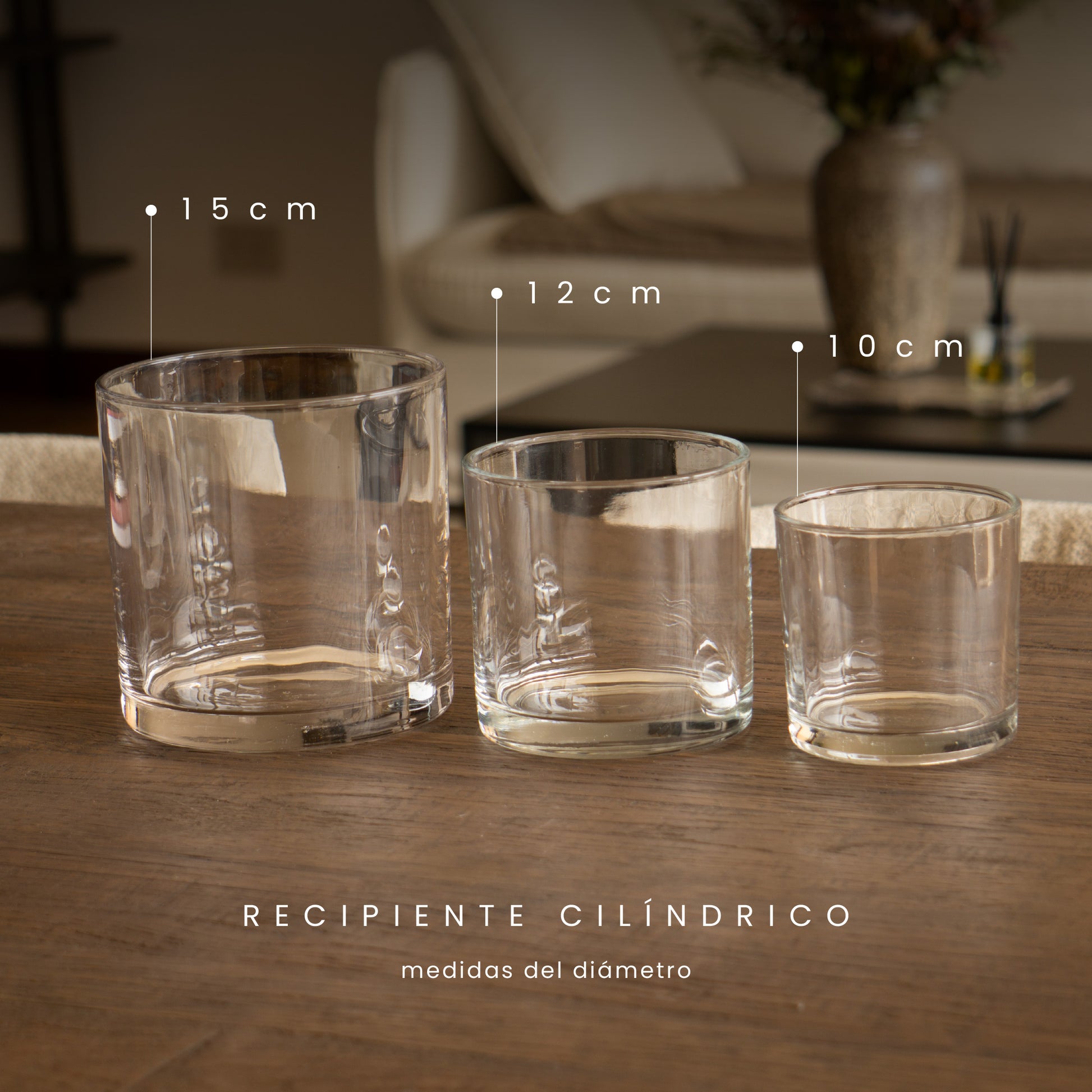 Este recipiente de vidrio cilíndrico mide 12 cm de diámetro y 12 cm de alto, ofreciendo un diseño versátil y elegante ideal para lucir las velas perladas. Fabricado en vidrio resistente, garantiza durabilidad y limpieza sencilla, siendo una opción práctica para uso en interiores.